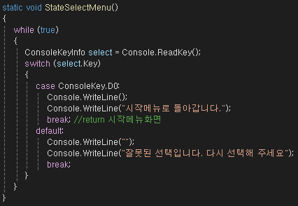>>Console.ReadKey를 활용한 메뉴선택창.
