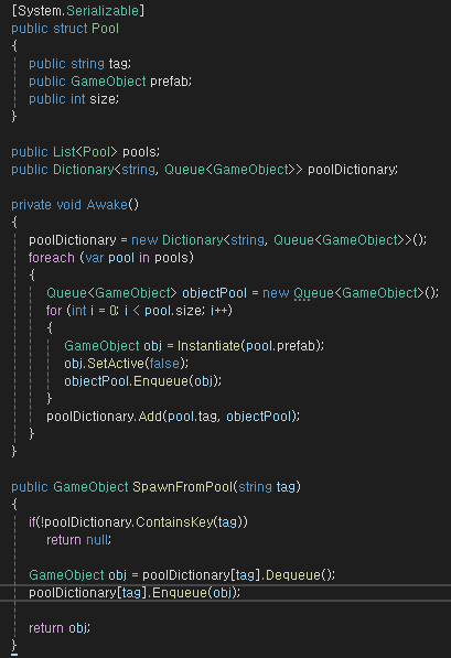 projectileManager스크립트에서 ObjectPool을 사용할 수 있게 수정도 해준다.