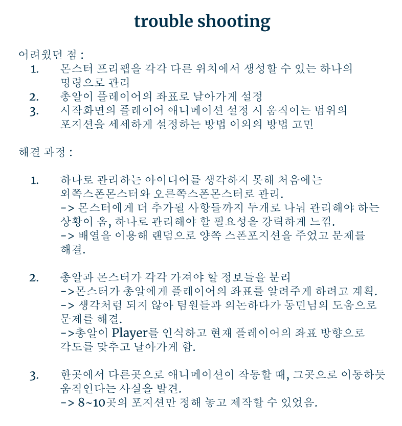 또한 여전히 실력이 부족한 나는 몬스터 및 총알 부분 구현 및 기타 쉬운 몇몇가지들 말고는 하고싶어도 할 수 없어서 많이 아쉬웠다.