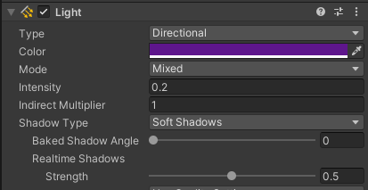 >>마음에 드는 컬러로 지정을 해주고, 밤이니 Intensity(밝기)는 0.2정도, 그림자의 강도는 0.5정도로 설정.