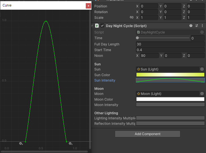 >>_DayNightCycle에 Sun과 Moon을 넣어주고 일단 해가 뜨고 지는 Curve를 설정해준다.
