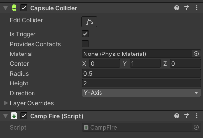 >>CampFire프리팹에 collider를 달아주는데, Is Trigger는 체크해준다.