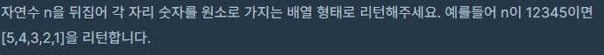 >>n을 string형태로 만들어 길이를 잡아주고, for문을 돌릴 때 strN.Length - i - 1를 해주어 거꾸로 배열이 만들어지게 만들었다. 예를 들어 n이 842156라면 strN.Length(길이)는 6개이고, strN.Length - i - 1에서 배열의 첫번째는 6-0-1=5 이므로 5번째인 6이라는 숫자가 맨 앞 순서가 된다. (i는 0부터 시작하니까)