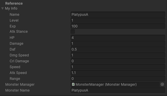 >>유니티에서 PlatypusA라는 MonsterName을 입력하면 정보를 가져오는것을 볼 수 있다.